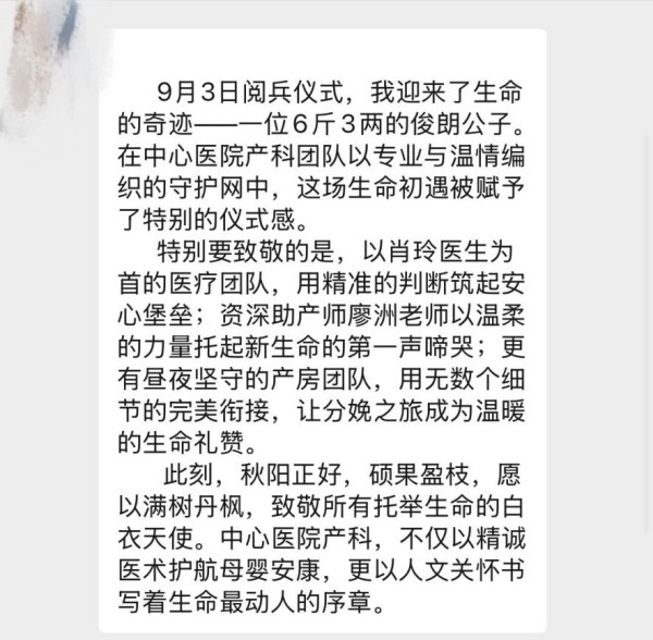 9月3日,当全国人民的目光聚焦阅兵盛况时,在我院产科的产房里,一场特殊的“生命阅兵”正在上演。一位有宫外孕病史的孕妇,在产科团队的全程守护下,顺利诞下一名体重3.15千克的健康男婴。母子平安的背后,是一段从孕期到分娩,精准医疗与人文关怀深度融合的护航历程。