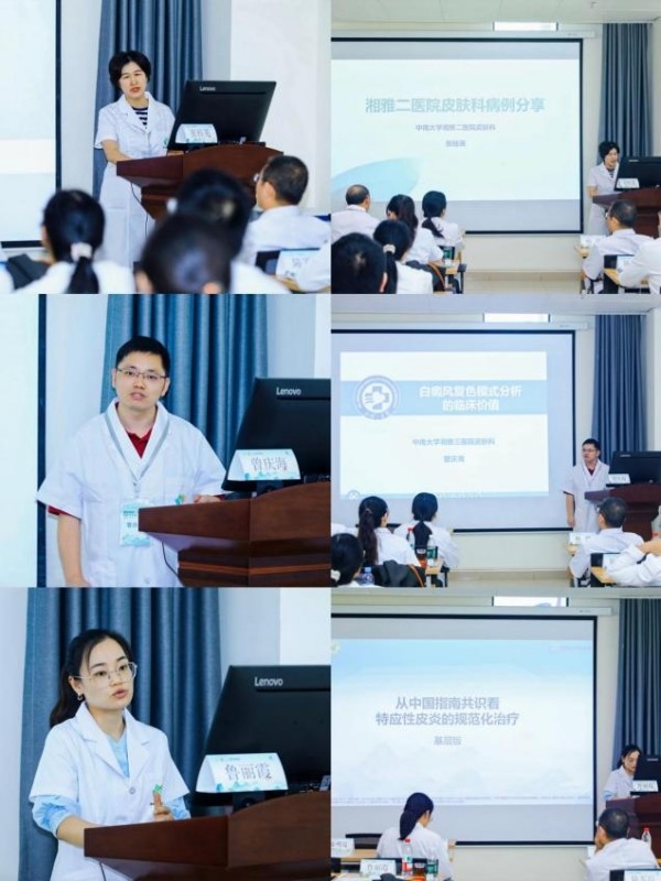 在学术交流环节,张桂英教授分享了多例皮肤病疑难病例。她结合多位患者的临床表现、免疫学检测结果及病理活检报告,详细分析了鉴别诊断思路;曾庆海医师以《白癜风复色模式分析的临床价值》为题,系统介绍了白癜风在复色过程中的不同模式及其临床意义;中南大学湘雅医院主治医师鲁丽霞解读了特应性皮炎的规范化治疗指南共识,阐述了该疾病规范化治疗路径。随后,与会专家围绕特应性皮炎等慢性皮肤病的管理难点,与基层医生开展了深入交流。
