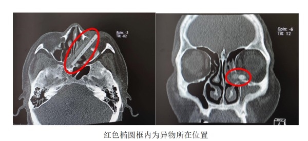 影像检查结果清晰显示,这两根异物(筷子)的穿行路径极为惊险:它们从左侧眼眶插入,径直穿透左侧鼻窦、鼻中隔,最终抵达右侧蝶窦。更让人捏一把汗的是,两根异物与眼球及眼眶内重要的肌肉组织紧紧相连,稍有偏差就可能造成不可逆的严重损伤。