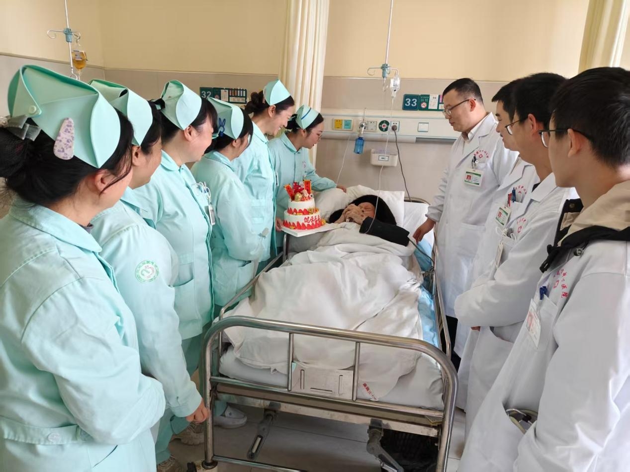 没有隆重的寿宴,却有最真挚的祝福。当天上午,全科医学科学科主任、副主任医师封波,护士长、主管护师胡德翀带领科室医护人员,手捧生日蛋糕,缓缓来到唐爷爷床边,齐声唱起生日歌。看着围在身边的“白衣亲人”,这位饱经风霜的老人眼含泪光,颤抖着双手紧紧握住医护人员,一遍遍地说着“谢谢,谢谢你们”。他激动地表示:“原本以为住院期间的生日会冷冷清清,没想到医生护士想得这么周到,你们就像我的亲人一样!”这一暖心举动也深深打动了在场的家属。“老爷子住院这段时间,多亏了医护人员的精心治疗和细心护理,没想到他们连生日这种小事都记在心里,这份情谊比任何礼物都珍贵。”家属感慨道。