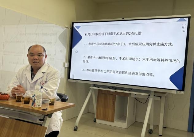 57岁的彭先生正是这一新模式的受益者。因间断性腹痛两年余,他在门诊被确诊为胆囊息肉,需实施胆囊切除术。考虑到彭先生工作繁忙、希望尽可能缩短住院时间的诉求,肝胆外科主任、主任医师杨永清在全面细致评估后,建议其接受日间手术,并亲自担任主刀医师。术前,肝胆外科、麻醉科、手术室、日间手术部联合开展多学科会诊,共同制定了以加速康复外科理念为核心的麻醉镇痛及围术期精准营养管理方案,为患者安全与快速康复筑牢坚实保障。